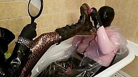 Two Beautiful Lesbian Slaves Taking A Bath In Front Of Dominant Mistress