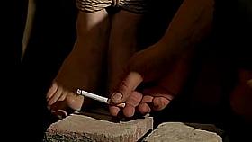 Hogtied sub subjected to bastinado